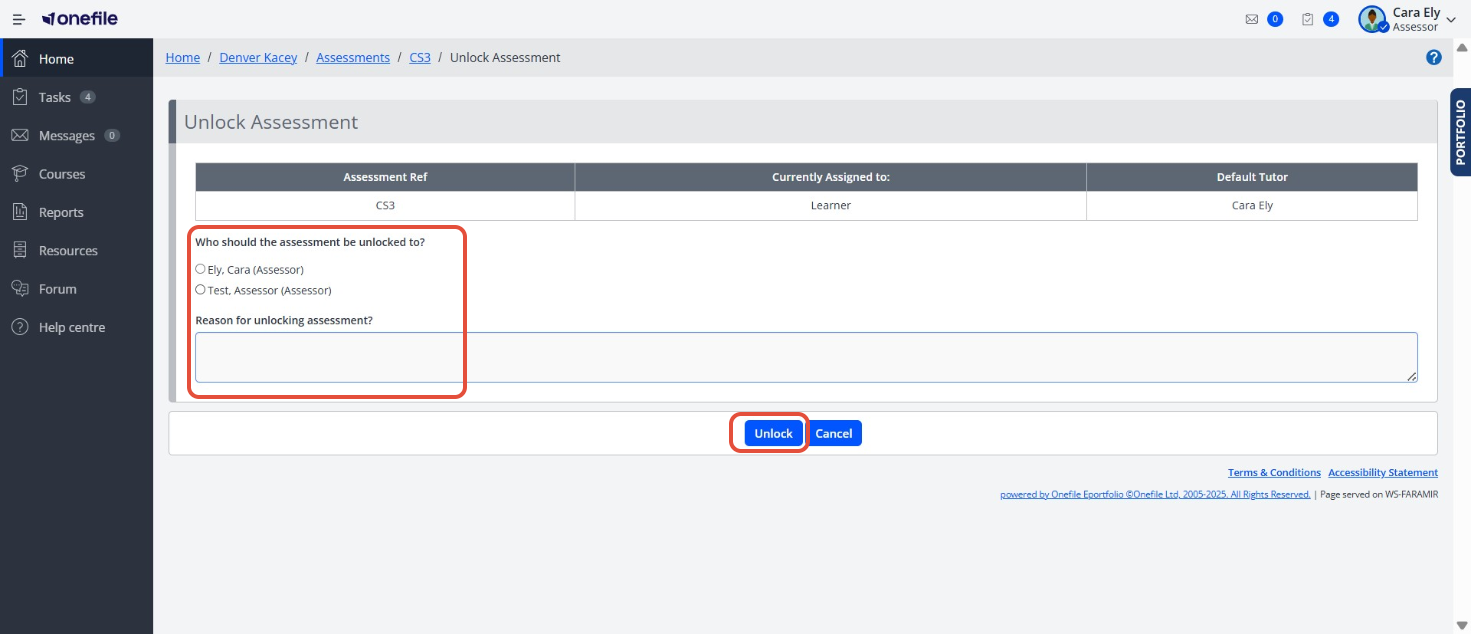- Select the User who the Assessment should be unlocked to and enter a reason for unlocking