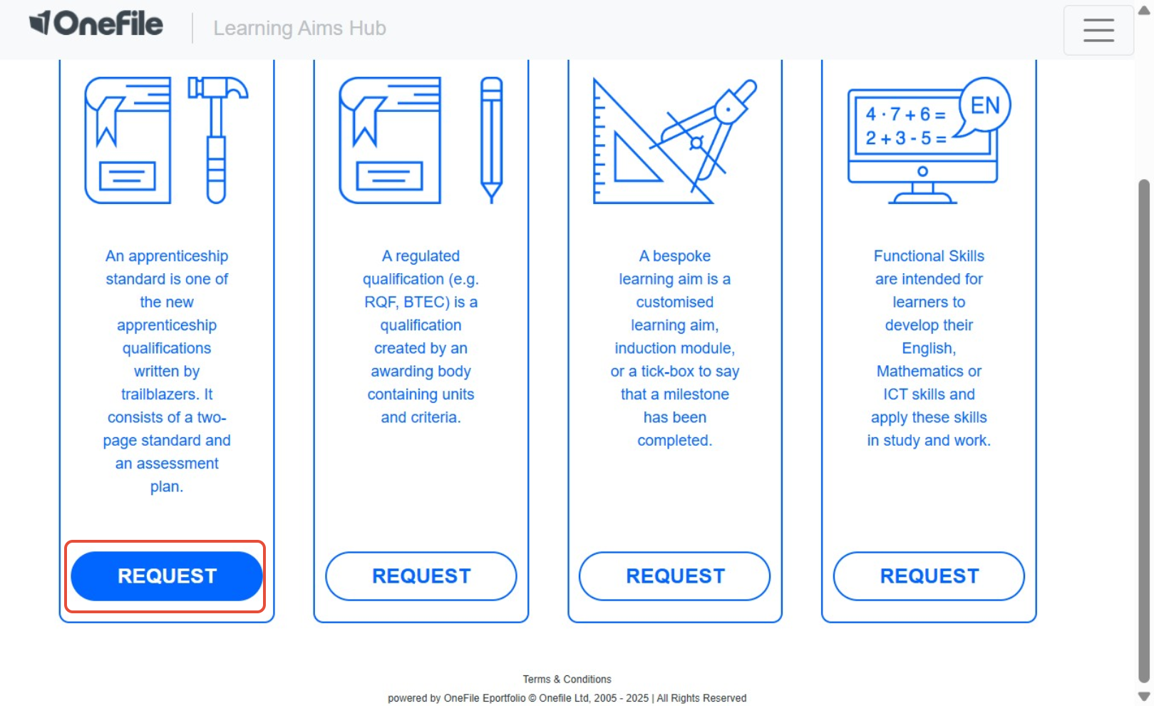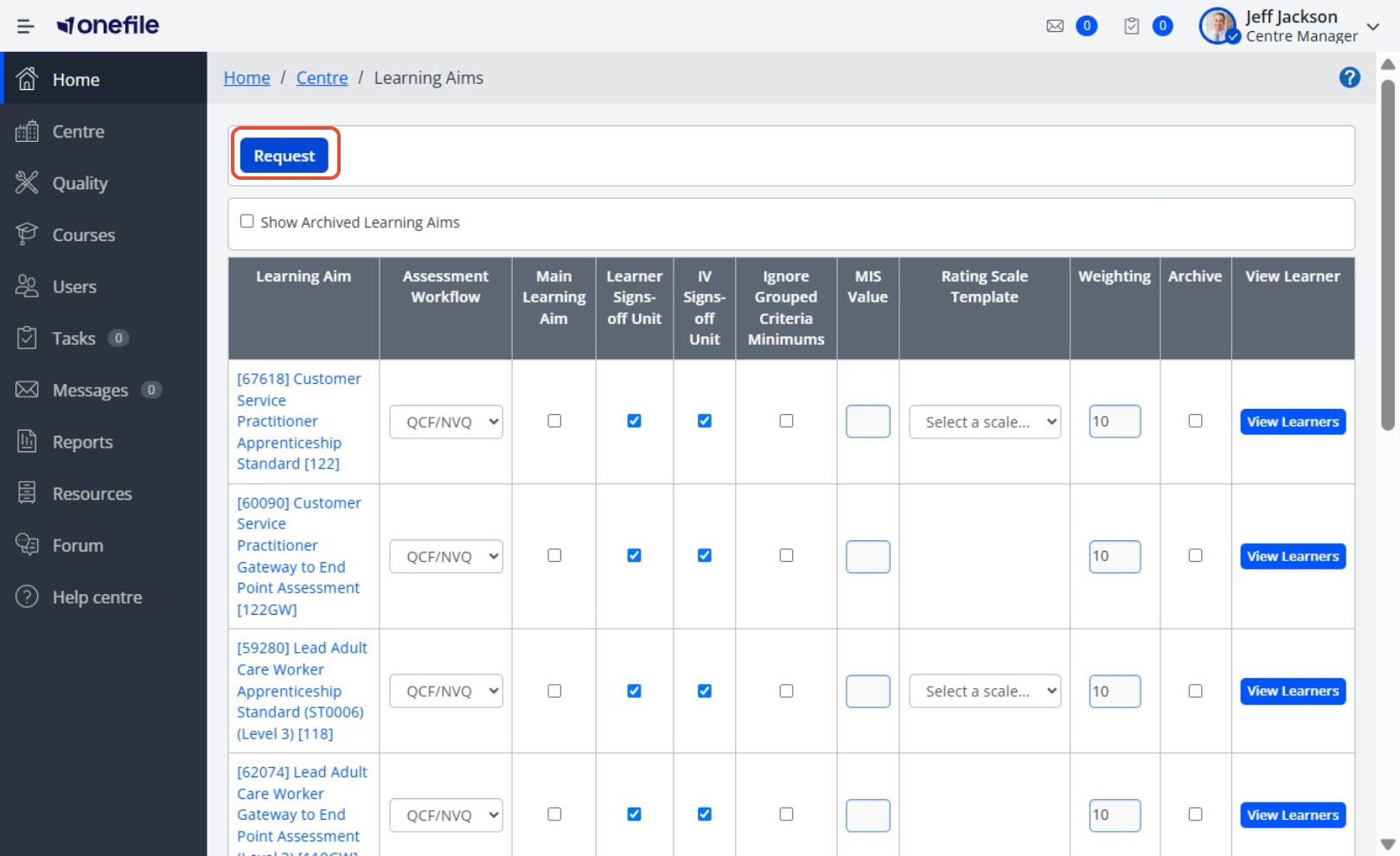 Centre Managers can request new qualifications directly through OneFile. This includes Regulated Qualifications, Apprenticeship Standards, Functional Skills, and Bespoke Qualifications.