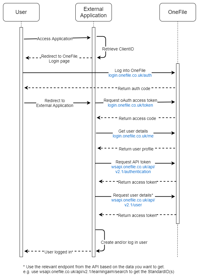 If you are developing, or planning to develop, Single Sign-On (SSO) using Onefile as the authentication provider, you may need additional information about the user when they log in. For example, you may want to retrieve the Standards they are assigned to, or other profile and learner‑related data. This can be done using the Onefile API during the SSO process.