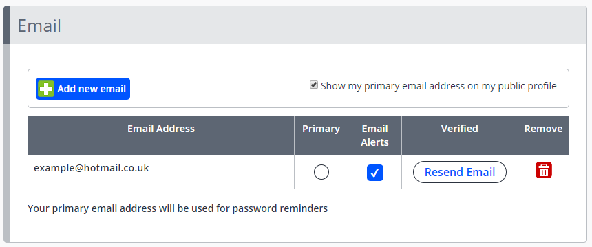 The Resend Email option will also appear automatically each time you log in, until your email address is either verified or removed.