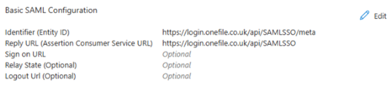 - Reply URL (ACS URL): https://login.onefile.co.uk/api/SAMLSSO