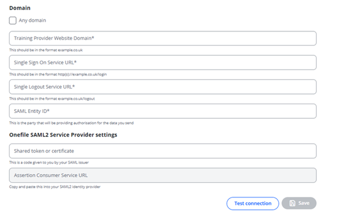 If your organisation has multiple Onefile Centres, you only need to configure SAML on one centre. The configuration automatically applies to all linked centres.