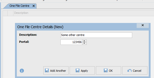 Tip – Multiple Onefile Centres: If you have multiple centres, enter a description and the PortalID on the Onefile Centre tab. The URL, username and password remain the same, but each Centre requires its own PortalID.