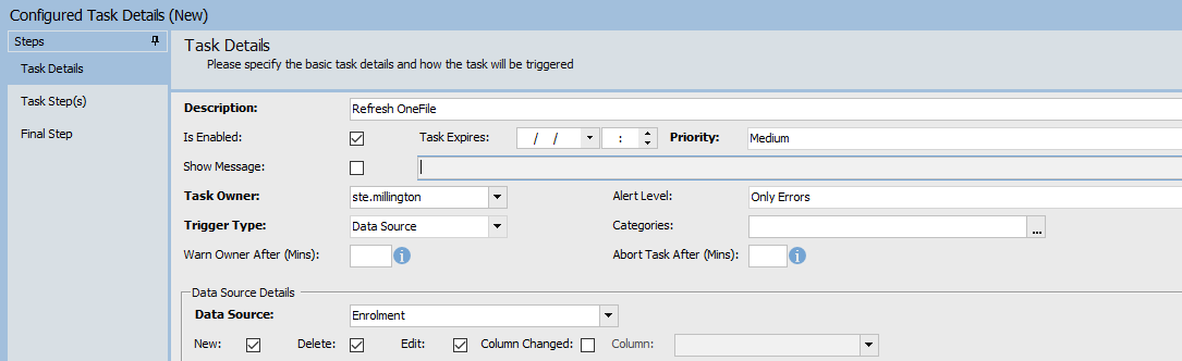 To complete the integration setup, a task must be created within ProSolution. This ensures data can be passed across to Onefile. (Your MIS lead or ProSolution administrator will usually complete this step.)