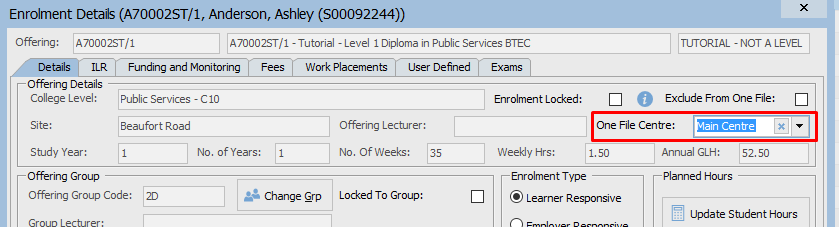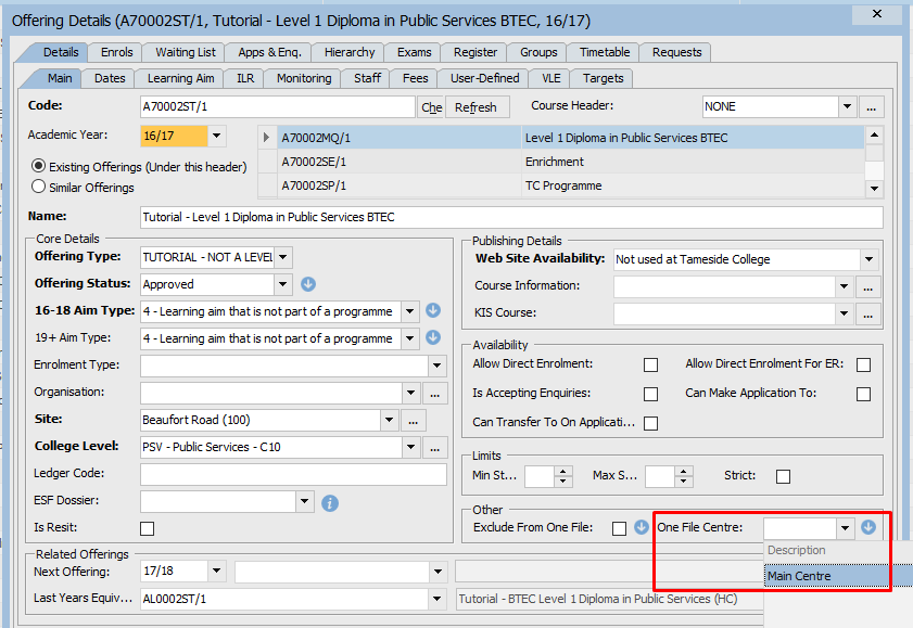 Once configured, it becomes possible to select the Onefile Centre at the Offering level in ProSolution. This selection cascades down to the enrolment level.