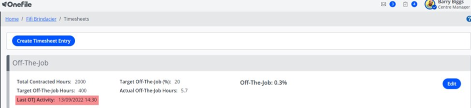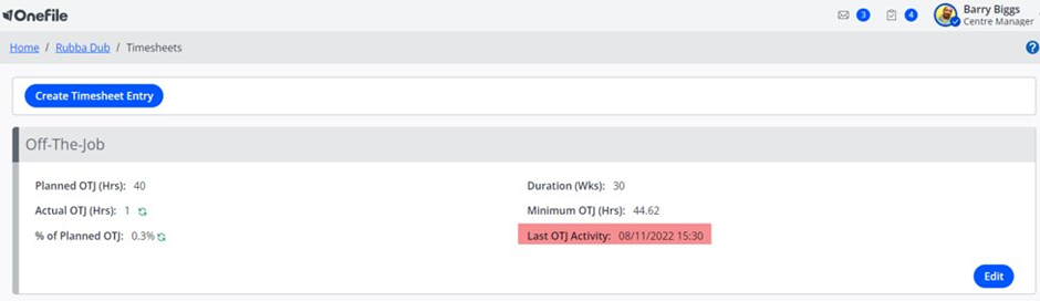 There are two ways to view a learner’s Off‑The‑Job (OTJ) activity within Onefile: via the Timesheet page and directly from the learner’s portfolio. Both views help track when the learner last completed OTJ activity and how many days have passed since then.