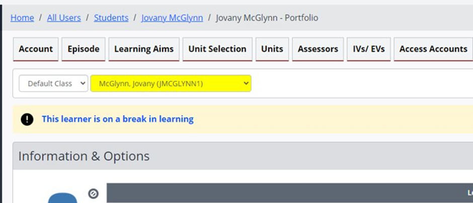 - If the learner is on a Break in Learning, a banner is shown at the top of the portfolio. Clicking this banner takes the user directly to the break‑in‑learning details.