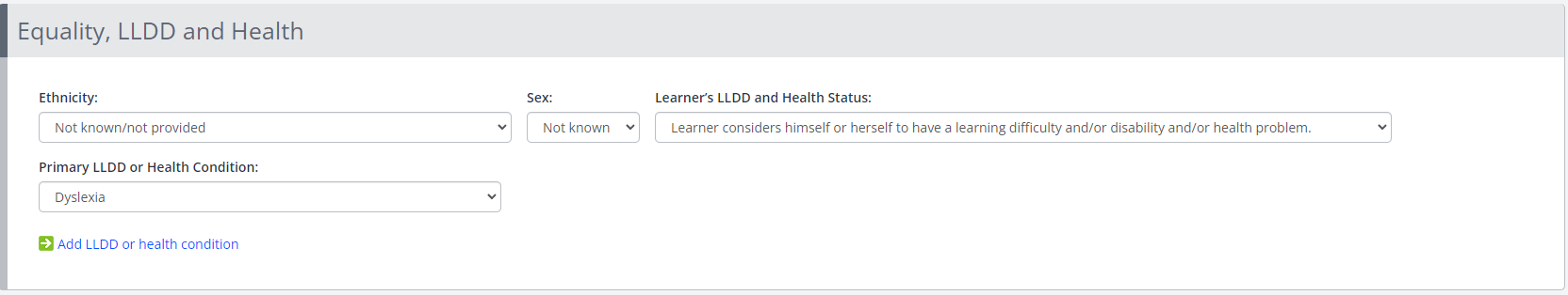 You can assign or update a learner’s LLDD (Learning Difficulty, Disability or Health Problem) information within their portfolio. This ensures accurate ILR reporting and supports individual learning needs. The LLDD and health problem categories come from the ESFA ILR (Individualised Learner Record) dataset.