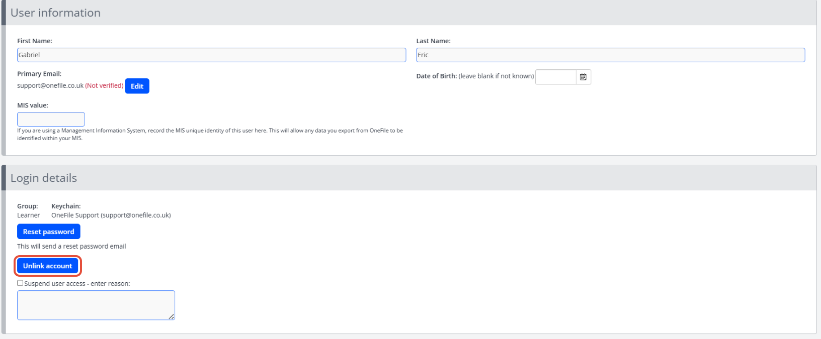 If a user’s account has been linked to an incorrect email address or no longer requires access, you can remove their account from a Keychain. This action should be carried out carefully to avoid disrupting a user’s access across multiple centres.