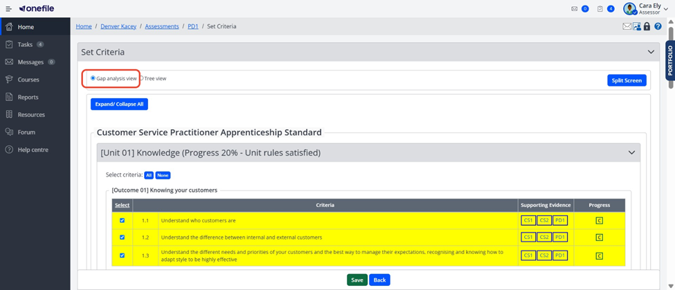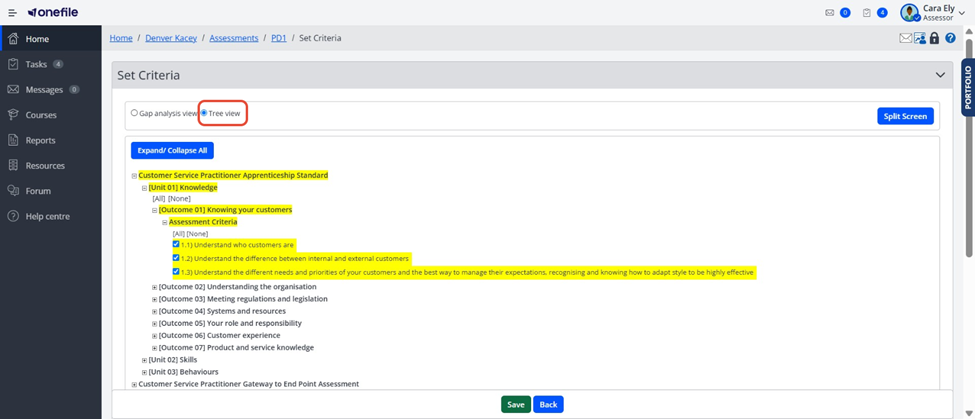 Users can set criteria within an assessment using two different views: Tree View and Gap Analysis View. These views help Assessors, Trainee Assessors, and Learners identify, select, and track the criteria required for the assessment.
