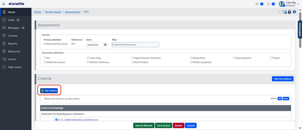 - If the assessment is set to Evidence Type per Criteria, only the user who starts the assessment can add criteria.
