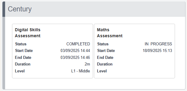 You can view a learner’s Century Initial Assessment results directly from their Onefile Eportfolio. The results are displayed within the Century tile once access requirements are met.